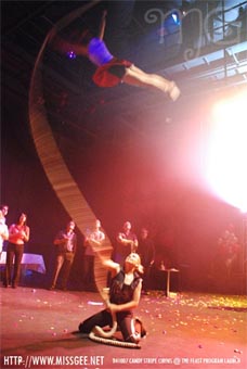 Candy Stripe Circus have several Aerial Silks Acts on offer which can be performed with many and varied Costumes, and various styles of music. The Aerial Silks can be performed as a Solo Act or as a Duo Act. Aerial Silks are wonderful for Events requiring style, passion, high-skill level entertainment, and fabulous for clients wanting to offer guests a huge 'wow' factor. Inventive twists, drops, wraps. Liquid human movement suspended on two red satin ropes 8m-10m in length. The Artists perform unaccountable feats of human acrobatic grace, contortion, agility, and spectacular strength.