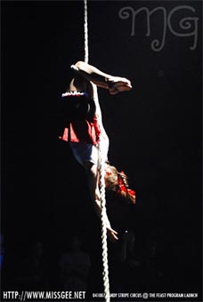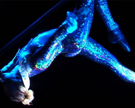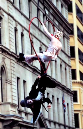 Aerial Strops - A unique Act on a unique apparatus. Many styles, costume and music to choose from. A skillful mastery of ropes and suspension. This most versatile of acts lends itself to small spaces as well as large. Cabaret, Clubs, Theatre, Openings, Diners, Conferences, Parties. Act builds to spinning finale.